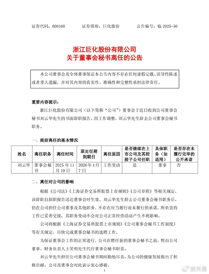 2025年11月19日晚间,巨化股份发布公告,宣布董事会秘书刘云华因“工作调整”原因辞职,辞职后仍在公司担任董事。