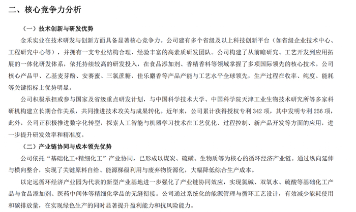 看看金禾实业在财报中对自己核心竞争力的描述: