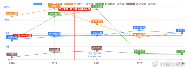 哪怕毛利下滑得这么严重,这几年三一的利润还是非常稳得住,甚至整体呈现增长势态,这几年反而是金风、阳明等非常悲惨。