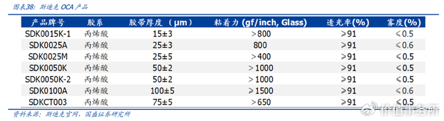 斯迪克最核心的一款新材料产品叫做OCA光学胶。OCA是将光学压敏胶做成无基材胶膜,然后在上下底层各贴合一层离型薄膜的双面贴合产品。这么干说比较难以理解,我举一个双面胶的例子大家就明白了,OCA光学胶其实更类似于一种双面胶,中间是胶水,两边各有一层膜,用的时候把膜去掉,两边就都可以粘结,起到胶连的作用。