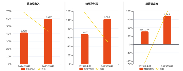 公司营业总收入为12.08亿元。归母净利润为1.52亿元。经营活动现金净流入为1.24亿元。