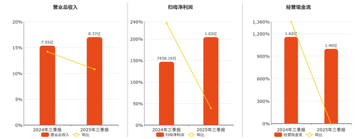 公司营业总收入为8.37亿元。归母净利润为1.03亿元。经营活动现金净流入为1.40亿元,较去年同报告期经营活动现金净流入减少2245.59万元,同比较去年同期下降13.83%。