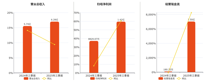 公司营业总收入为6.28亿元。归母净利润为1.42亿元。经营活动现金净流入为1.50亿元。