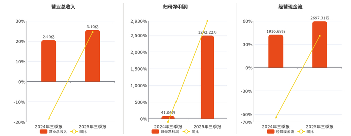 公司营业总收入为3.10亿元。归母净利润为1242.22万元。经营活动现金净流入为2697.31万元。