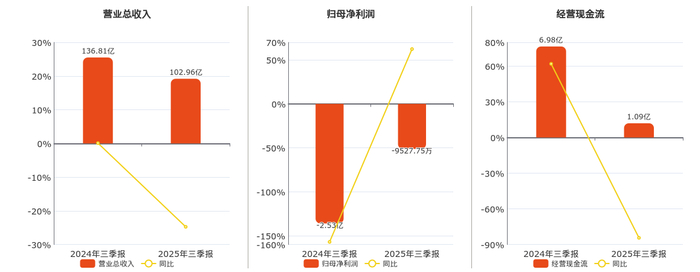 公司营业总收入为102.96亿元。归母净利润为-9527.75万元,较去年同报告期归母净利润增加1.58亿元。经营活动现金净流入为1.09亿元。
