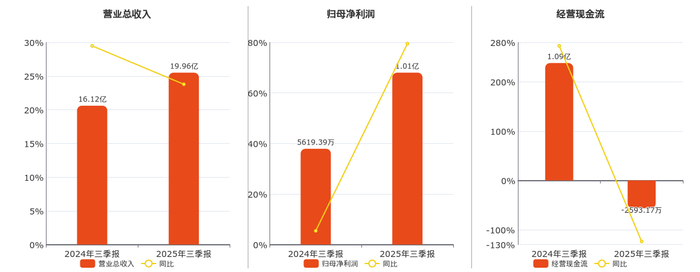 公司营业总收入为19.96亿元。归母净利润为1.01亿元。经营活动现金净流入为-2593.17万元,较去年同报告期经营活动现金净流入减少1.35亿元,同比较去年同期下降123.69%。