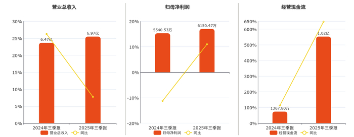 公司营业总收入为6.97亿元。归母净利润为6150.47万元。经营活动现金净流入为1.02亿元。