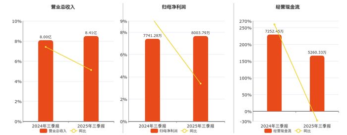 公司营业总收入为8.41亿元。归母净利润为8003.79万元。经营活动现金净流入为5260.33万元,较去年同报告期经营活动现金净流入减少1992.12万元,同比较去年同期下降27.47%。