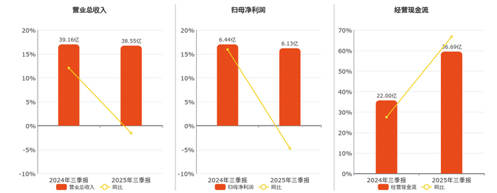 公司营业总收入为38.55亿元,在已披露的同业公司中排名第22,较去年同报告期营业总收入减少6100.55万元,同比较去年同期下降1.56%。归母净利润为6.13亿元,在已披露的同业公司中排名第19,较去年同报告期归母净利润减少3051.22万元,同比较去年同期下降4.74%。经营活动现金净流入为36.69亿元,在已披露的同业公司中排名第13,较去年同报告期经营活动现金净流入增加14.69亿元,实现2年连续上涨,同比较去年同期上涨66.76%。