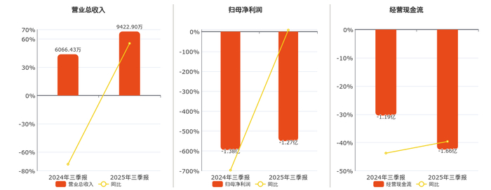 公司营业总收入为9422.90万元,在已披露的同业公司中排名第72。归母净利润为-1.27亿元,在已披露的同业公司中排名第69。经营活动现金净流入为-1.66亿元,在已披露的同业公司中排名第64,较去年同报告期经营活动现金净流入减少4700.20万元。
