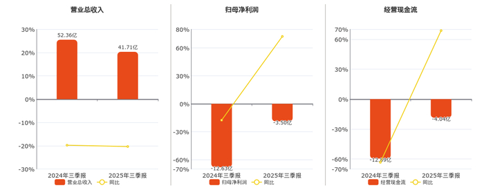 公司营业总收入为41.71亿元,在已披露的同业公司中排名第40。归母净利润为-3.50亿元,较去年同报告期归母净利润增加9.14亿元。经营活动现金净流入为-4.04亿元,较去年同报告期经营活动现金净流入增加8.85亿元。