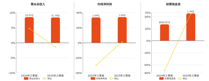 公司营业总收入为21.70亿元,较去年同报告期营业总收入减少3095.84万元,同比较去年同期下降1.41%。归母净利润为1.05亿元。经营活动现金净流入为1.34亿元。