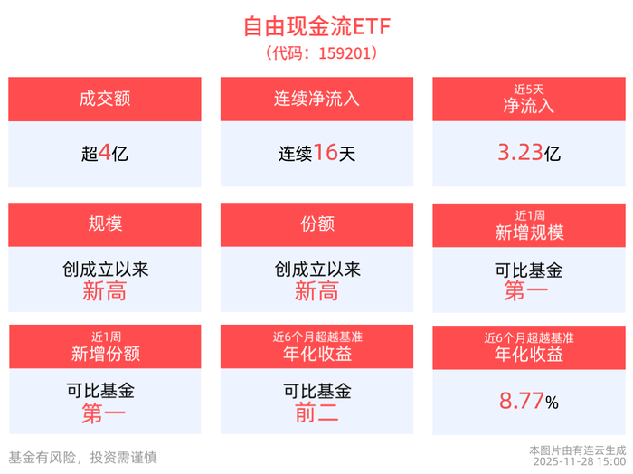 截至11月28日,自由现金流ETF近6月净值上涨18.11%。从收益能力看,截至2025年11月28日,自由现金流ETF自成立以来,最高单月回报为7.00%,最长连涨月数为6个月,最长连涨涨幅为22.69%,涨跌月数比为7/2,上涨月份平均收益率为3.20%,月盈利百分比为77.78%,月盈利概率为80.81%,历史持有6个月盈利概率为100.00%。截至2025年11月28日,自由现金流ETF近6个月超越基准年化收益为8.77%。