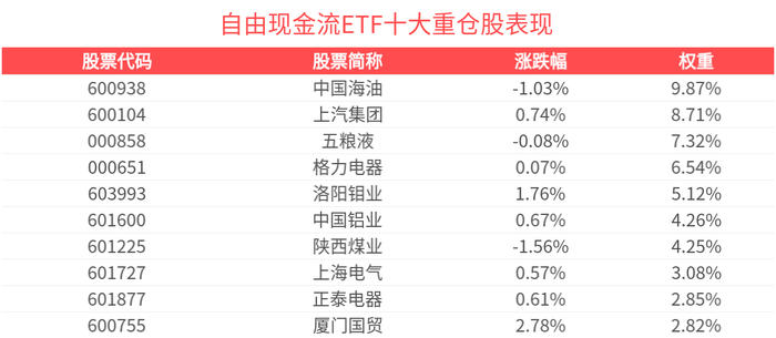 自由现金流ETF紧密跟踪国证自由现金流指数,数据显示,截至2025年11月28日,国证自由现金流指数前十大权重股分别为中国海油、上汽集团、五粮液、格力电器、中国铝业、洛阳钼业、陕西煤业、厦门国贸、上海电气、正泰电器,前十大权重股合计占比54.4%。