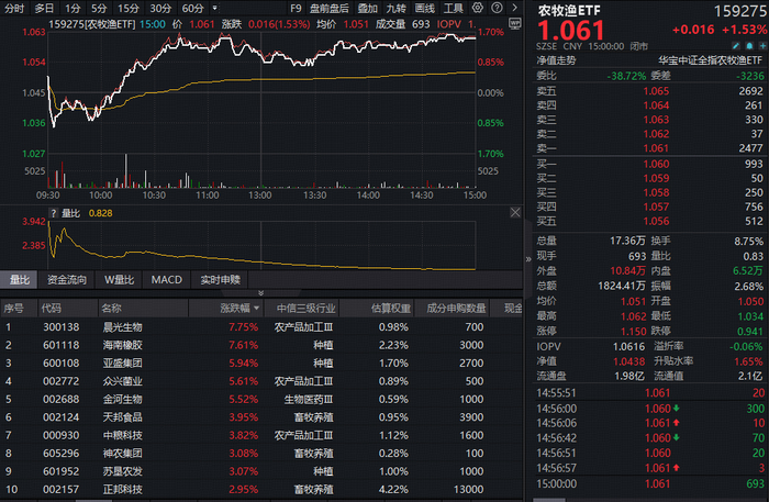 农牧渔板块继续拉升。全市场首只农牧渔ETF(159275)早盘短暂低位震荡后迅速拉升,截至收盘,场内价格大涨1.53%,日线三连阳,收盘价续创上市以来新高。