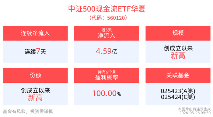 从收益能力看,截至2026年3月25日,中证500现金流ETF华夏自成立以来,最高单月回报为18.04%,最长连涨月数为3个月,最长连涨涨幅为28.85%,涨跌月数比为6/1,上涨月份平均收益率为6.94%,月盈利百分比为85.71%,月盈利概率为87.05%,历史持有6个月盈利概率为100.00%。