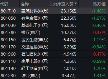 按申万一级行业分类来看,建筑材料、有色金属、基础化工等板块今日获主力净流入居前。