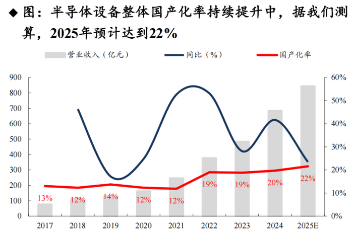 在国产晶圆厂资本支出浪潮的强劲驱动下,海量订单正源源不断地涌向本土半导体设备厂商。随着国产设备竞争力的不断提升,刻蚀、清洗、CMP等关键环节实现阶段性突破,新建产线纷纷倾向于配置更高比例的“中国造”。机构测算显示,半导体设备整体国产化率已从2017年的13%稳步上升至2024年的20%,并有望在2025年进一步达到22%。