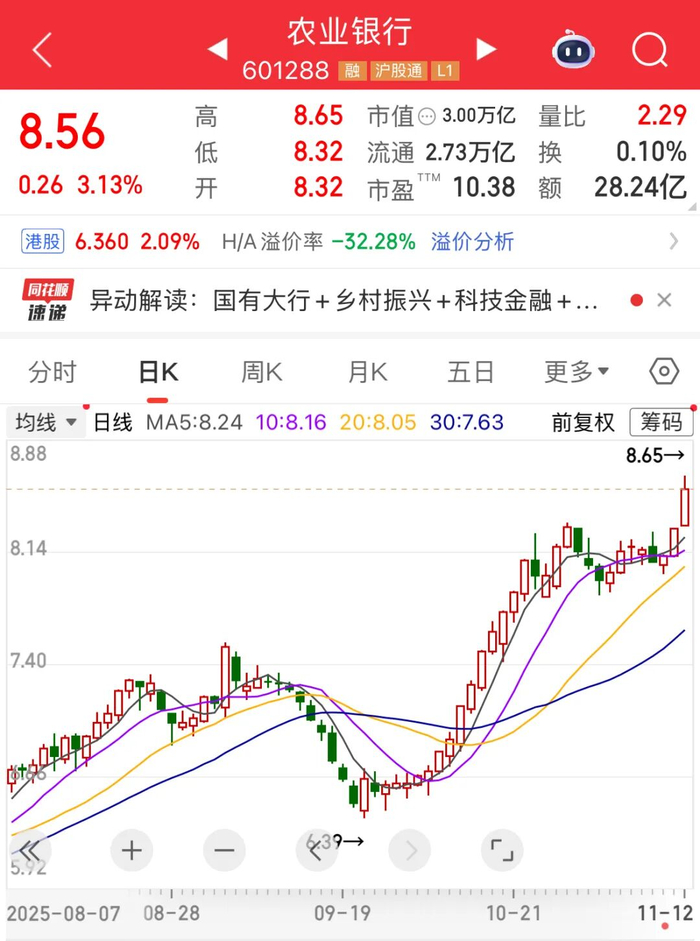 承接近期强势,农业银行A股今日早盘继续大涨,盘中一度涨至8.65元/股,再度创出历史新高。农业银行H股同样大涨超2%,创出历史新高。银行板块整体走势抢眼,涨幅超过1%,工商银行A股股价也创出历史新高。