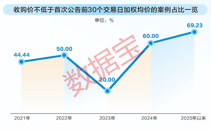 最后,对中小股东保护意识强化。近年来,监管层对要约价格的合规性监管趋严。以今年以来上市公司作为目标方的案例来看,要约价格较首次公告日前30个交易日的加权均价存在溢价的案例数量占比近七成,占比创2021年以来新高,平均溢价率超过7%,为2021年以来次新高。