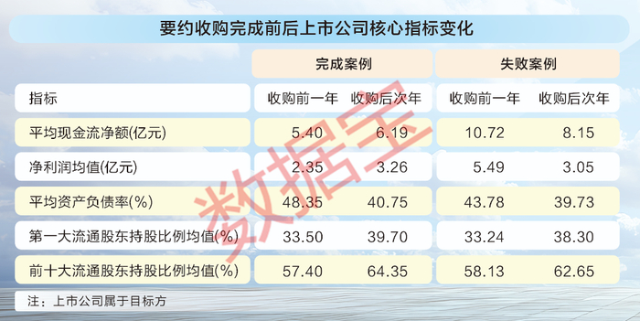 从资产负债和股东指标看,首次公告日上一年,标的公司平均资产负债率超过48%,第一大流通股东持股比例均值33.5%;收购完成后次年标的公司平均资产负债率下降至41%以下,第一大流通股东持股比例均值提升至近40%。
