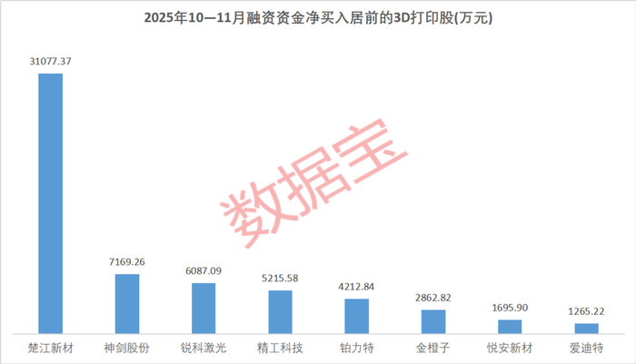 据证券时报·数据宝统计,今年四季度以来(截至11月底),融资净买入超过1000万元的3D打印股共计8只,楚江新材、神剑股份、锐科激光、精工科技对应金额在5000万元以上,依次为3.11亿元、7169.26万元、6087.09万元、5215.58万元。