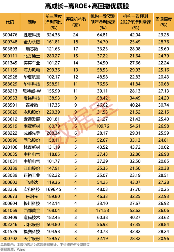 据证券时报·数据宝统计,3家及以上机构评级且三季报净利同比翻倍增长、扣非平均净资产收益率超5%的个股中,有30只个股机构一致预测明后两年净利增速均超20%,且最新价较年内高点回调超20%。