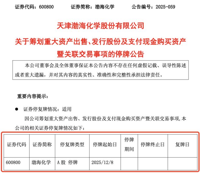 渤海化学股票将自2025年12月8日(下周一)开市起停牌,预计停牌时间不超过10个交易日。