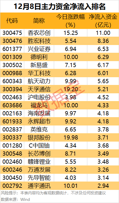 PCB龙头股胜宏科技主力资金净流入8.36亿元,居次席。证券板块大涨,兴业证券盘中涨停,收盘涨近7%,主力资金净流入6.53亿元。消息面上,12月6日,中国证监会主席吴清表示,对优质机构适当“松绑”,进一步优化风控指标,适度打开资本空间和杠杆限制,提升资本利用效率。