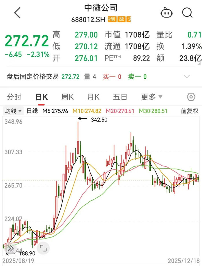 截至目前,中微公司最新股价272.72元/股,总市值1707.62亿元,股东户数60782户。2025年前三季度,公司营业收入80.63亿元,同比增长46.4%。其中刻蚀设备收入61.01亿元,同比增长38.26%;LPCVD和ALD等薄膜设备收入4.03亿元,同比增长1332.69%。归母净利润12.11亿元,同比增长32.66%。