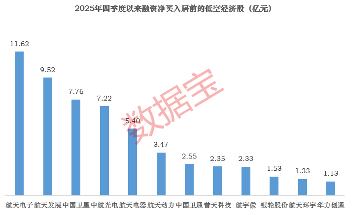 证券时报·数据宝梳理了2025年四季度以来(截至12月17日),融资客净买入居前的低空经济股,其中,金额在1亿元以上的个股共计12只。航天电子、航天发展、中国卫星、中航光电、航天电器排名前五,依次为11.62亿元、9.52亿元、7.76亿元、7.22亿元、5.4亿元。