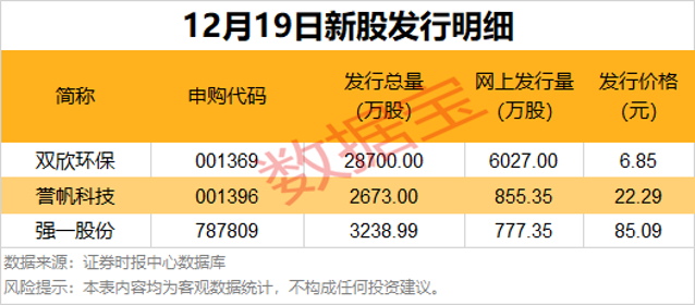 统计显示,今日共有3只新股申购,分别为深市主板的双欣环保、誉帆科技,科创板的强一股份。