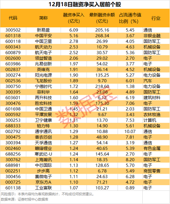 具体到个股,12月18日获融资净买入千万元以上的有379股,其中29股融资净买入额均超1亿元。