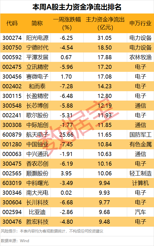 净流出方面,本周46股主力资金净流出在5亿元以上。阳光电源主力资金净流出额居于榜首,高达31.05亿元;宁德时代、平潭发展、立讯精密、赛微电子排在第二至第五位,主力资金净流出额均在17亿元以上。