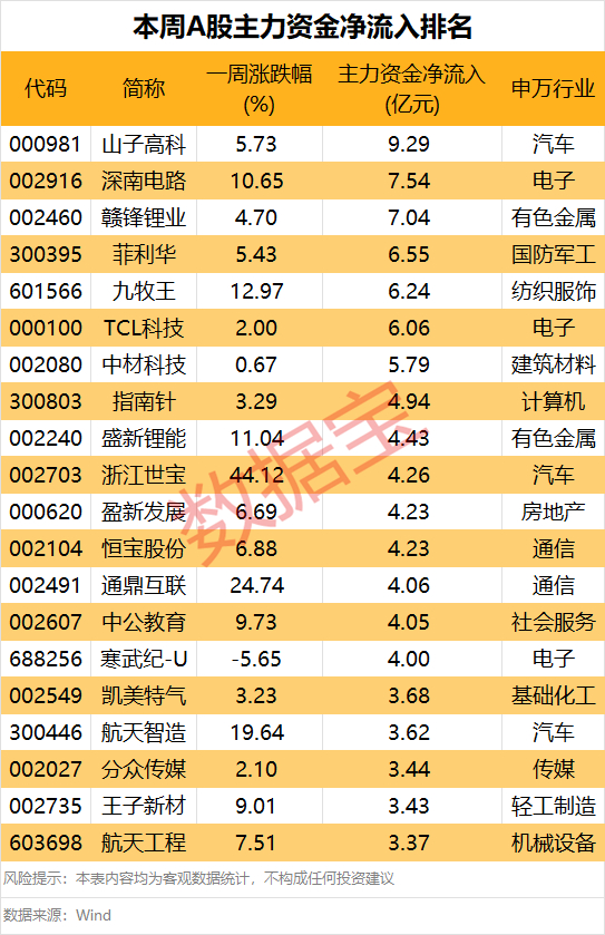 个股方面。除去近期上市新股,本周166股主力资金净流入1亿元以上。山子高科、深南电路、赣锋锂业排名前三,主力资金净流入额依次为9.29亿元、7.54亿元、7.04亿元;菲利华、九牧王、TCL科技、中材科技紧随其后,主力资金净流入额均在5亿元以上。