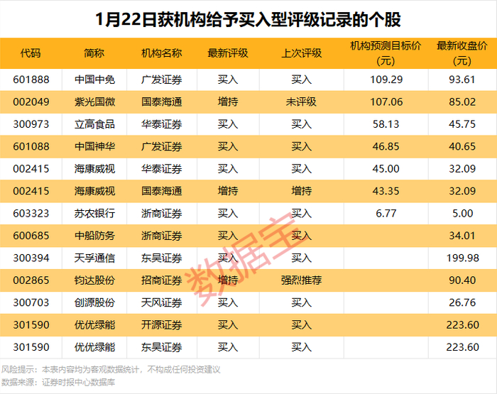 海康威视上涨空间最高,1月22日华泰证券预计公司目标价为45元,上涨空间达40.23%;上涨空间较高的个股还有苏农银行、立高食品,上涨空间分别为35.40%、27.06%。市场表现方面,机构给予买入型评级的个股今日平均上涨1.30%,表现强于沪指。股价上涨的有5只,涨停的有钧达股份。涨幅居前的有中船防务、天孚通信、中国神华,今日涨幅分别为7.49%、5.96%、1.42%。