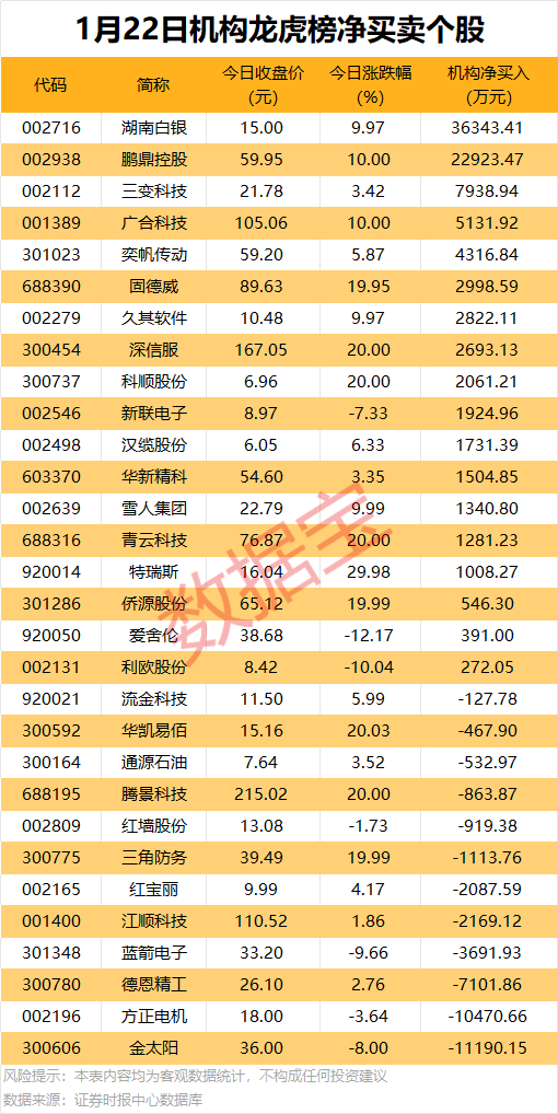今日龙虎榜中,净买入个股有18只,净卖出的个股为12只。15股净买入金额均超千万元,湖南白银、鹏鼎控股获机构分别净买入3.63亿元、2.29亿元,居前;其次是三变科技、广合科技、奕帆传动,机构净买入金额均超4000万元。机构净卖出个股中,金太阳遭机构净卖出1.12亿元,居首;紧随其后是方正电机,净卖出金额为1.05亿元。