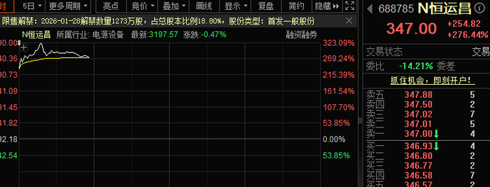 今日共有2只新股上市,N恒运昌开盘价310.00元,上涨236.30%;N农大开盘价49.90元,上涨99.60%。