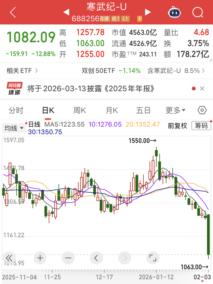 AI芯片概念早盘遭到重创。龙头股寒武纪-U盘中一度跌超14%,最新股价跌破1100元/股。该股昨日收盘时A股市值为5237.33亿元,今日大跌之后,A股市值已不足4600亿元。