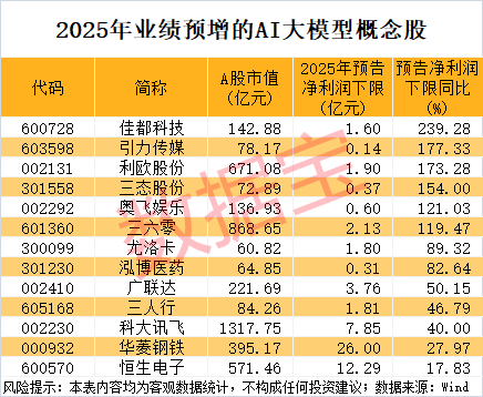 从已披露的业绩预告、业绩快报数据来看,按照业绩预告净利润下限计算(若无下限则取公告数值),2025年净利润同比增长(含扭亏为盈)的AI大模型概念股有13只,其中佳都科技、引力传媒、利欧股份、三态股份、奥飞娱乐等净利润增速居前。