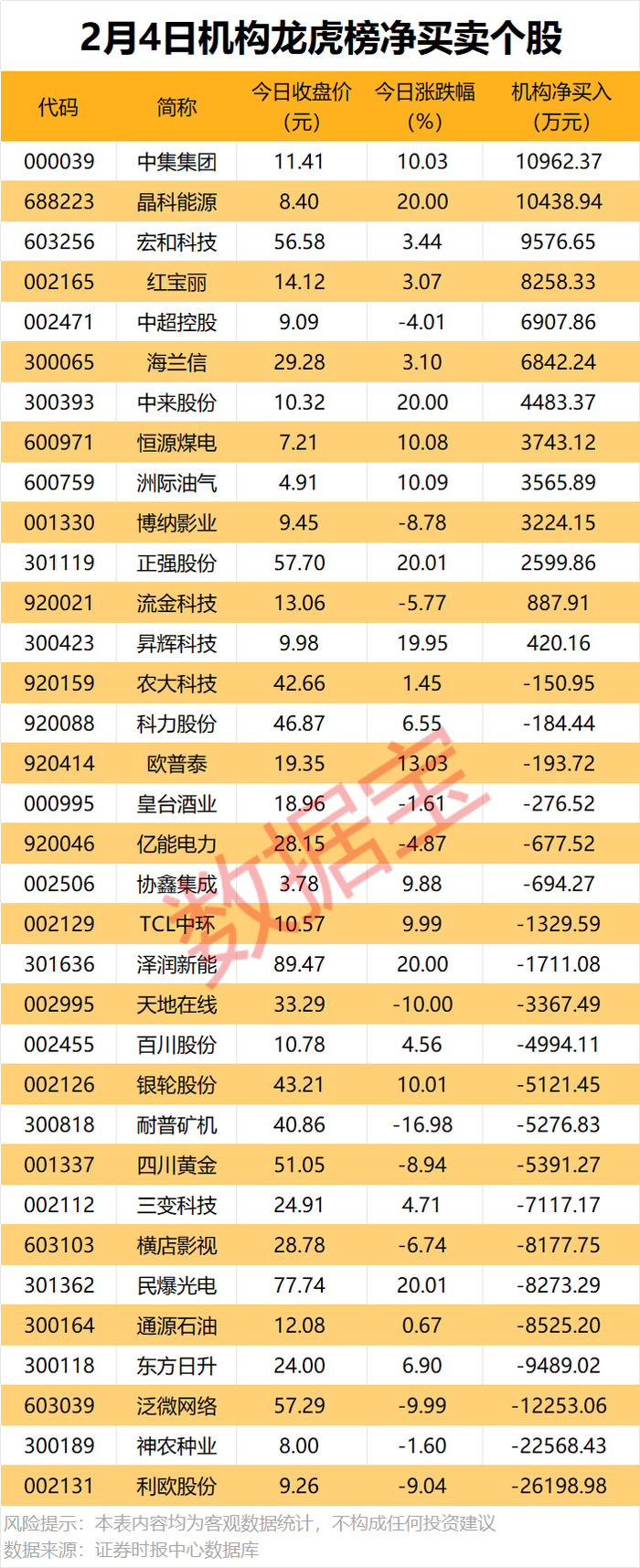 今日龙虎榜中,机构净买入个股有13只,净卖出个股有21只。11股机构净买入金额超2000万元,中集集团、晶科能源净买入均超1亿元。