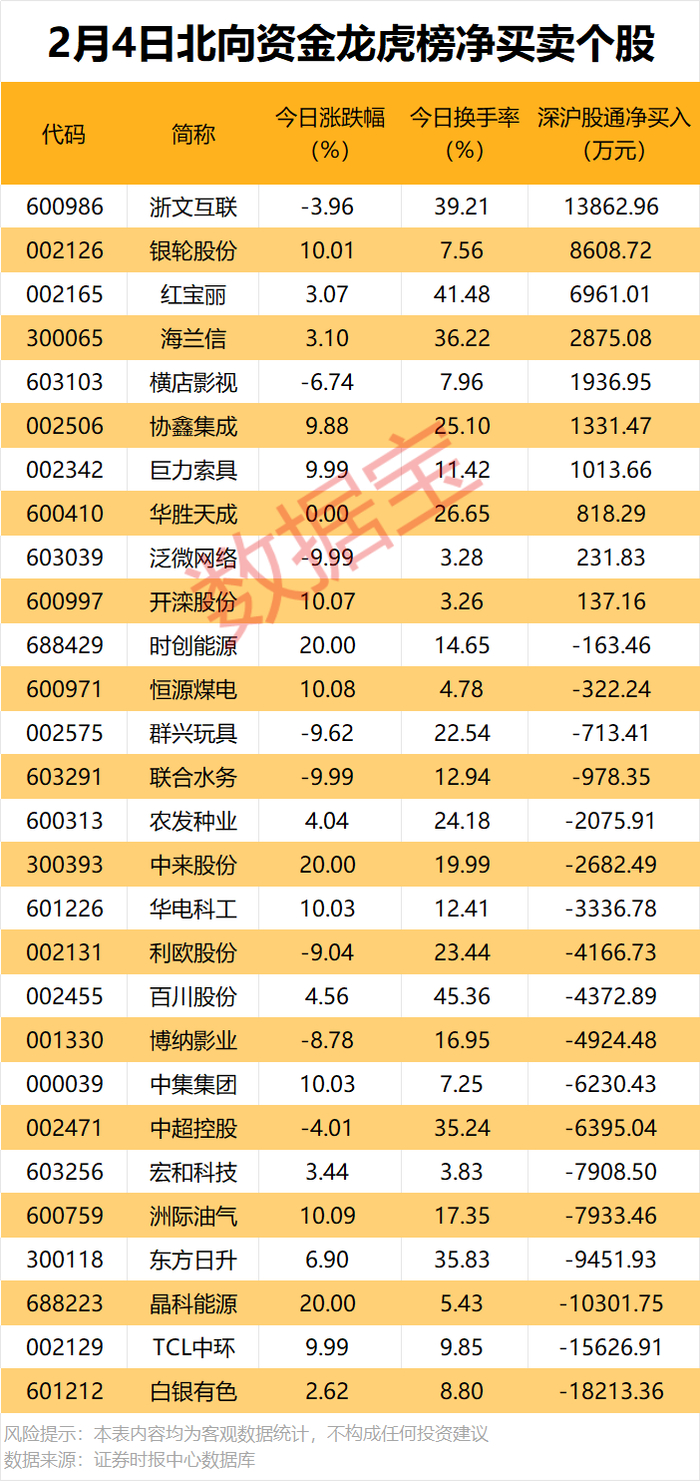今日龙虎榜现身个股中,10股获北向资金净买入。净买入居首的是浙文互联,金额为1.39亿元;银轮股份、红宝丽均获净买入超6000万元。