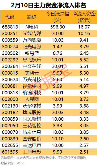 此外,还有万向钱潮、阳光电源、新易盛、奥飞娱乐和中文在线等热门股主力资金净流入金额居前,均超5亿元。