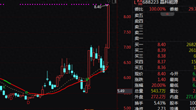 市场热点方面,光伏设备概念股全天保持强势,午后涨幅进一步扩大,板块指数连续第2日放量高开高走,大涨4.76%创2年半来新高。晶科能源(688223)午后开盘仅仅约7分钟直线20%涨停,时创能源、中来股份、泽润新能等纷纷强势“20cm”封板。