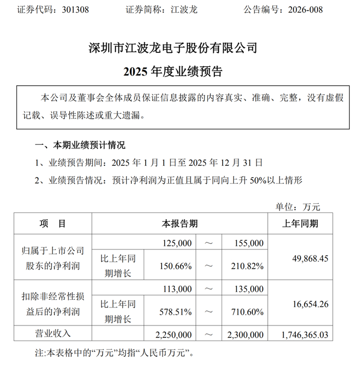 其中最受关注的似乎是江波龙,这家公司上周发布了2025年业绩预告。预计全年营业收入225亿元至230亿元,同比增长约28.8%至31.7%;预计归母净利润12.5亿元至15.5亿元,同比增长150.66%至210.82%;预计扣非净利润11.3亿元至13.5亿元,同比增长578.51%至710.60%。