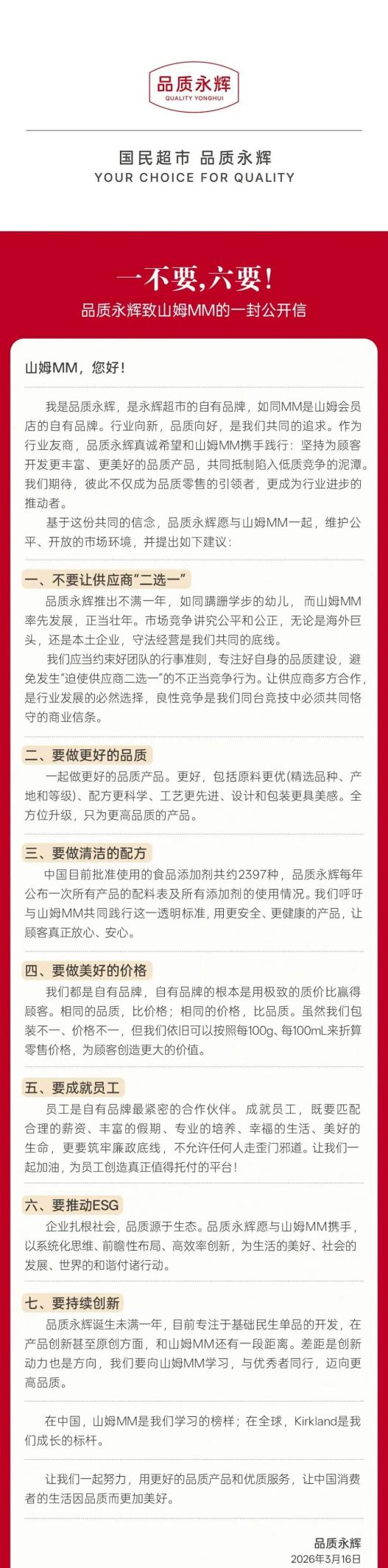 3月16日晚上,永辉超市(601933.SH)旗下自有品牌“品质永辉”,突然在官方公众号发了一封《致山姆MM的公开信》。没有拐弯抹角,没有同行间的客套,直接把矛头对准了零售巨头——山姆会员店的自有品牌Member's Mark(MM)。
