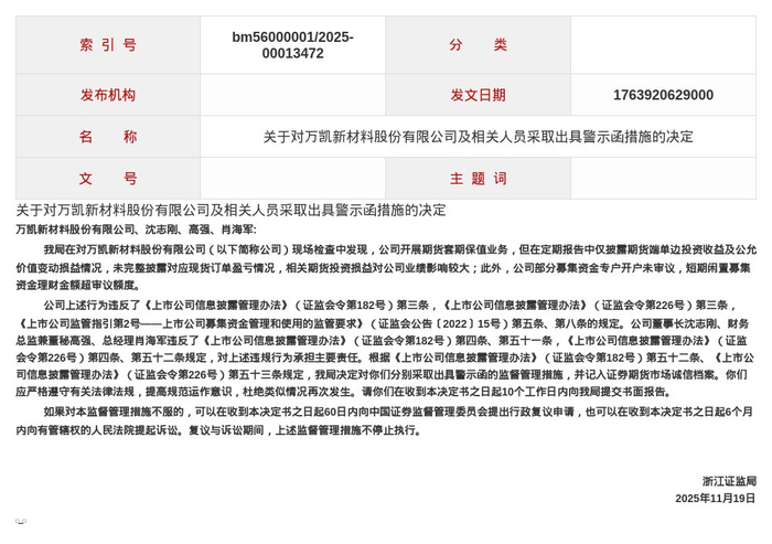 蓝鲸新闻11月24日讯,近日,浙江证监局发布了行政监管措施决定书,剑指万凯新材料股份有限公司(以下简称公司)及相关人员。