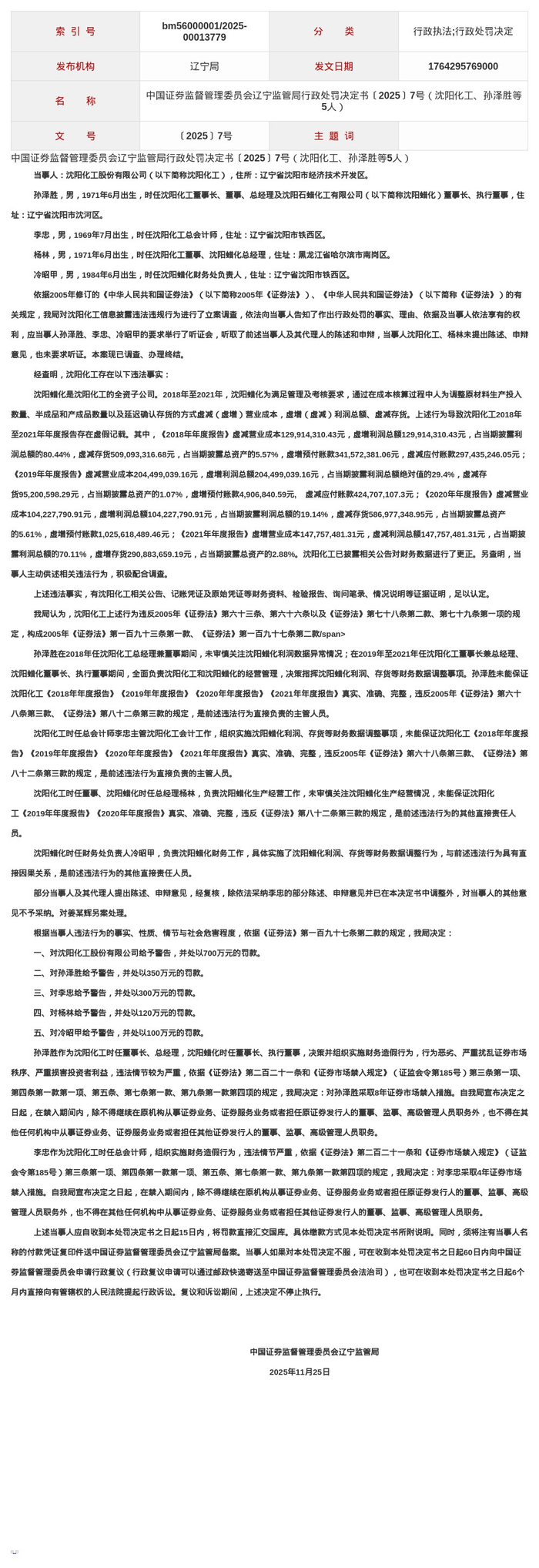 孙泽胜作为沈阳化工时任董事长、总经理及沈阳蜡化董事长、执行董事,是前述违法行为直接负责的主管人员,被给予警告并处以350万元罚款,同时被采取8年证券市场禁入措施。