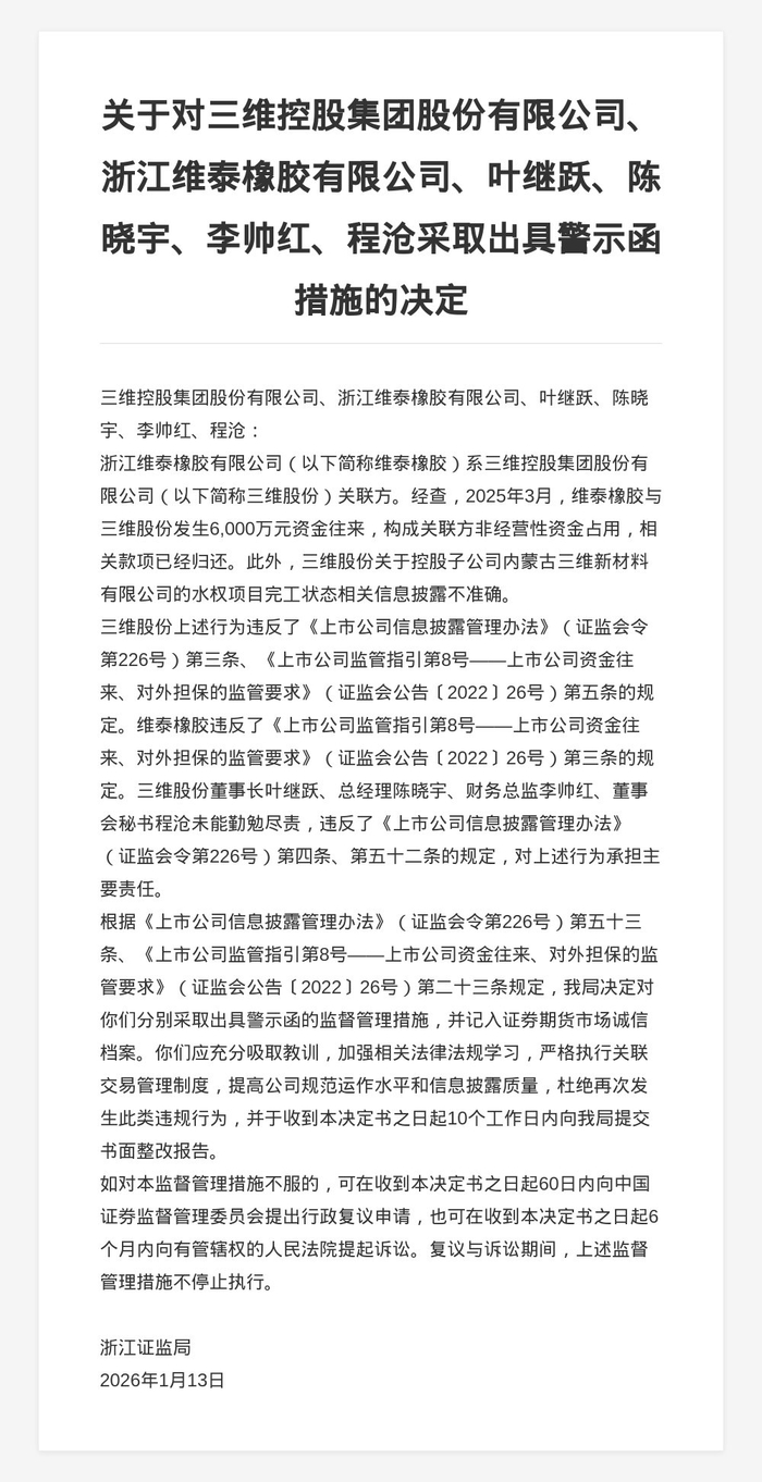 对此,浙江证监局决定对三维控股集团股份有限公司、浙江维泰橡胶有限公司、叶继跃、陈晓宇、李帅红、程沧分别采取出具警示函的监督管理措施,并记入证券期货市场诚信档案。