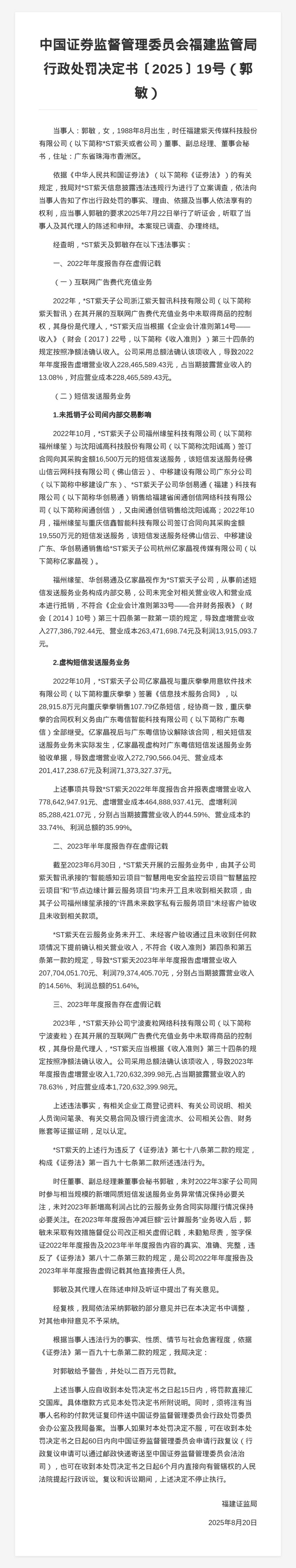 蓝鲸新闻1月20日讯,近日,福建证监局发布行政监管措施决定书,剑指*ST紫天董事郭敏。